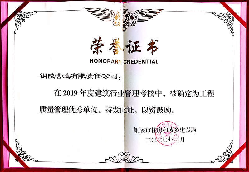銅陵營造有限責任公司是國家住建部核準的房屋建筑總承包一級企業(yè)。2006年7月,企業(yè)二次改制為民營企業(yè),并更名為“銅陵營造有限責任公司”。目前,公司擁有房建施工總承包、市政公用工程總承包、鋼結(jié)構(gòu)專業(yè)工程承包、建筑裝修裝飾專業(yè)工程承包四項壹級資質(zhì),機電安裝、起重設(shè)備安裝、建筑幕墻三項貳級資質(zhì),地基與基礎(chǔ)一項叁級資質(zhì)。2008年通過北京恩格威ISO9001、ISO14001和OHSAS18001“三合一”體系認證。